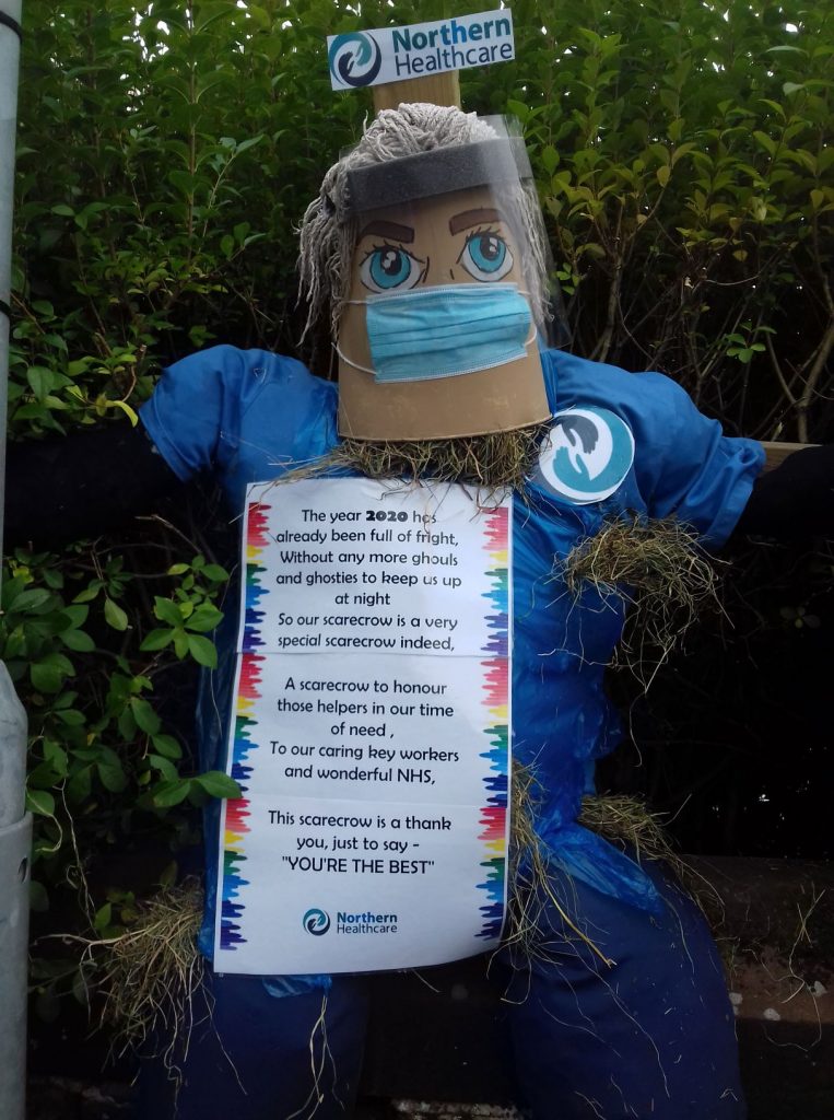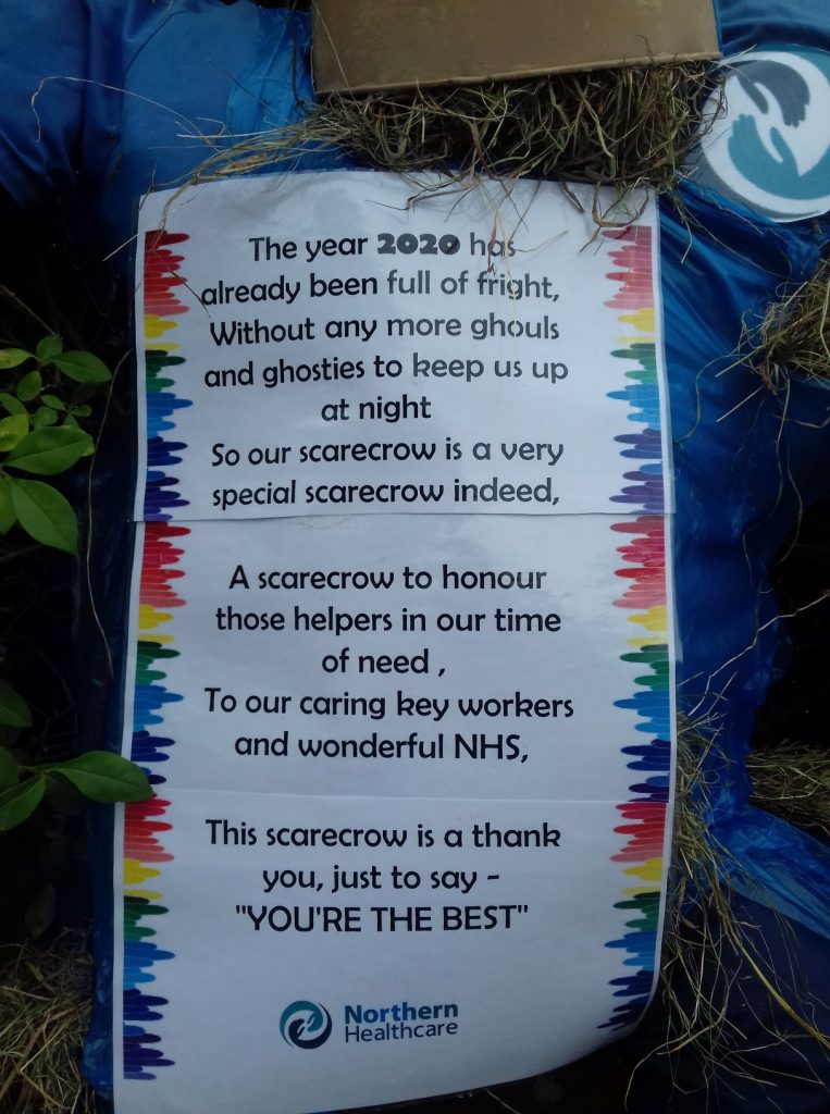 Due to the current restrictions, celebrating Halloween with the traditional ‘Trick or Treat’ isn’t possible. But once again communities are coming up with their own ways of marking the occasion whilst following the guidelines. In Barrow the community are marking the occasion by making scarecrows! Glen Garth House and Tenby House decided to make a not so scary scarecrow for our keyworkers and they even enlisted the help of the poetry group.