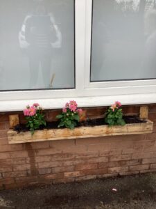 Our residents look proud of themselves and so they should! Here they stand in front of homemade planters they’ve stocked with flowers ready for the summer.