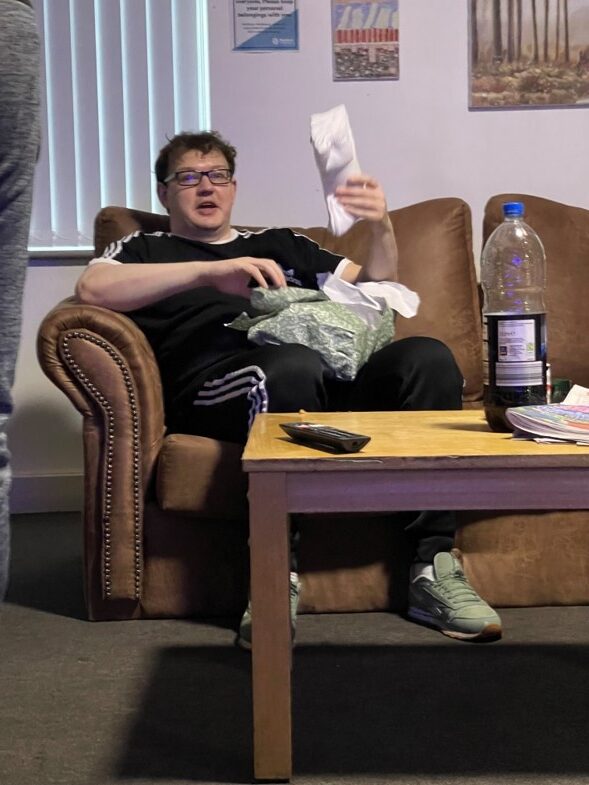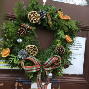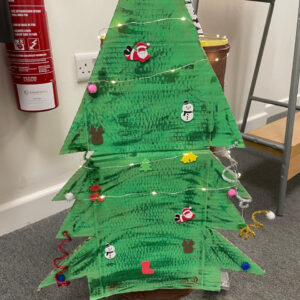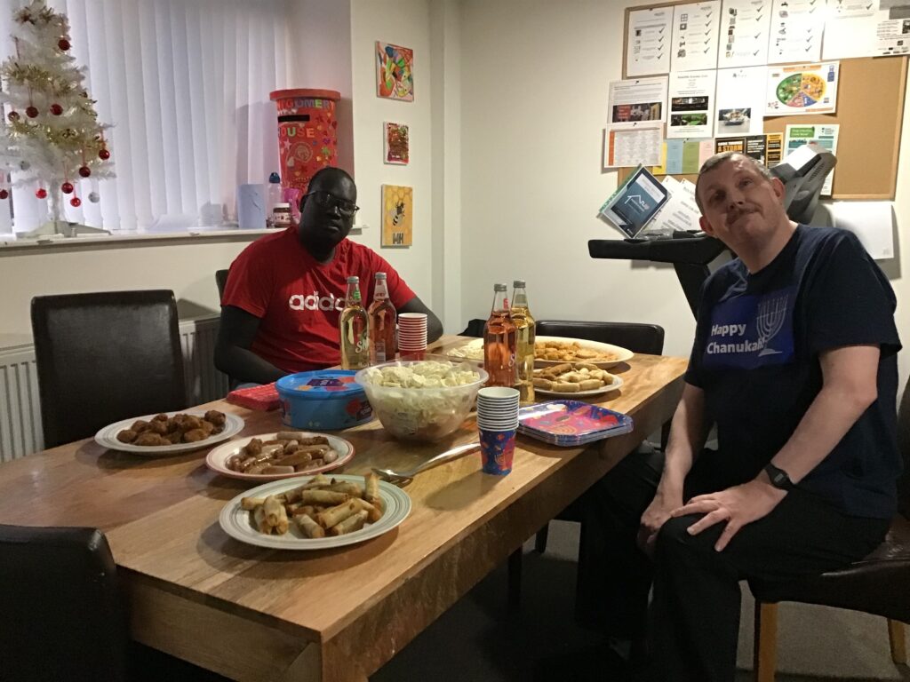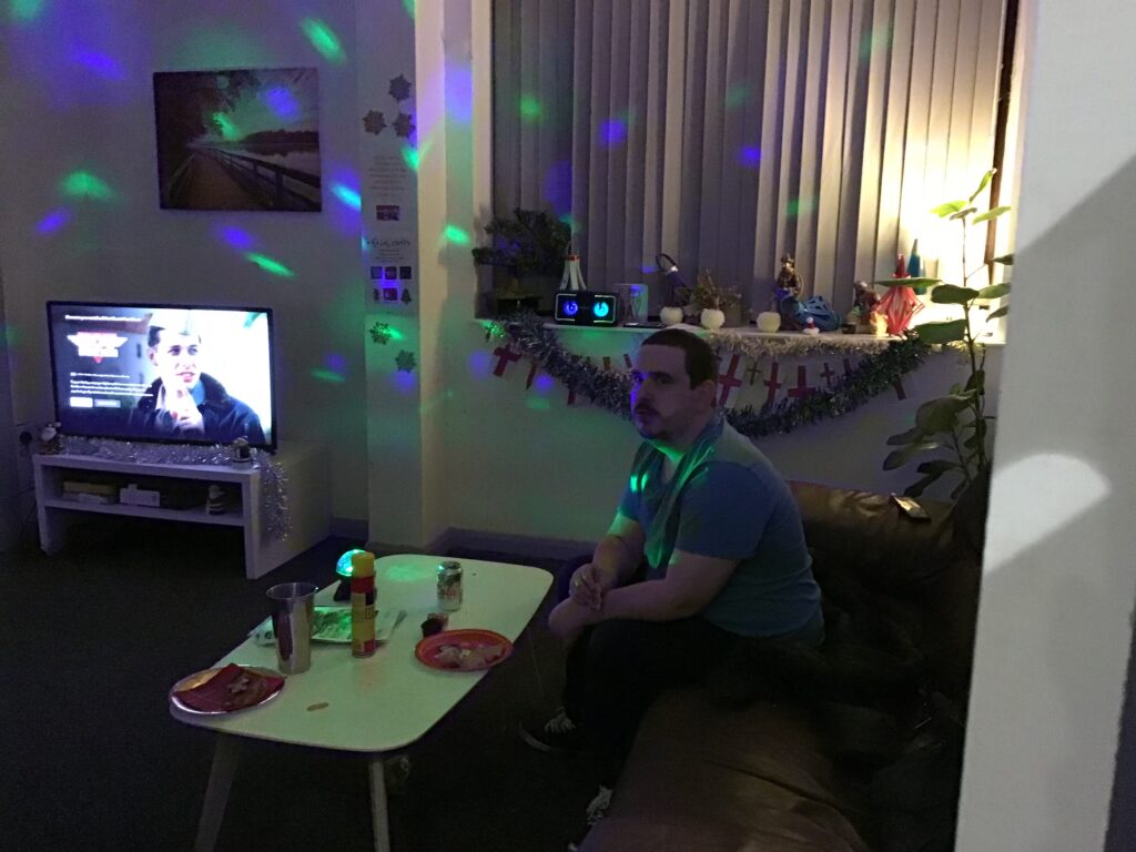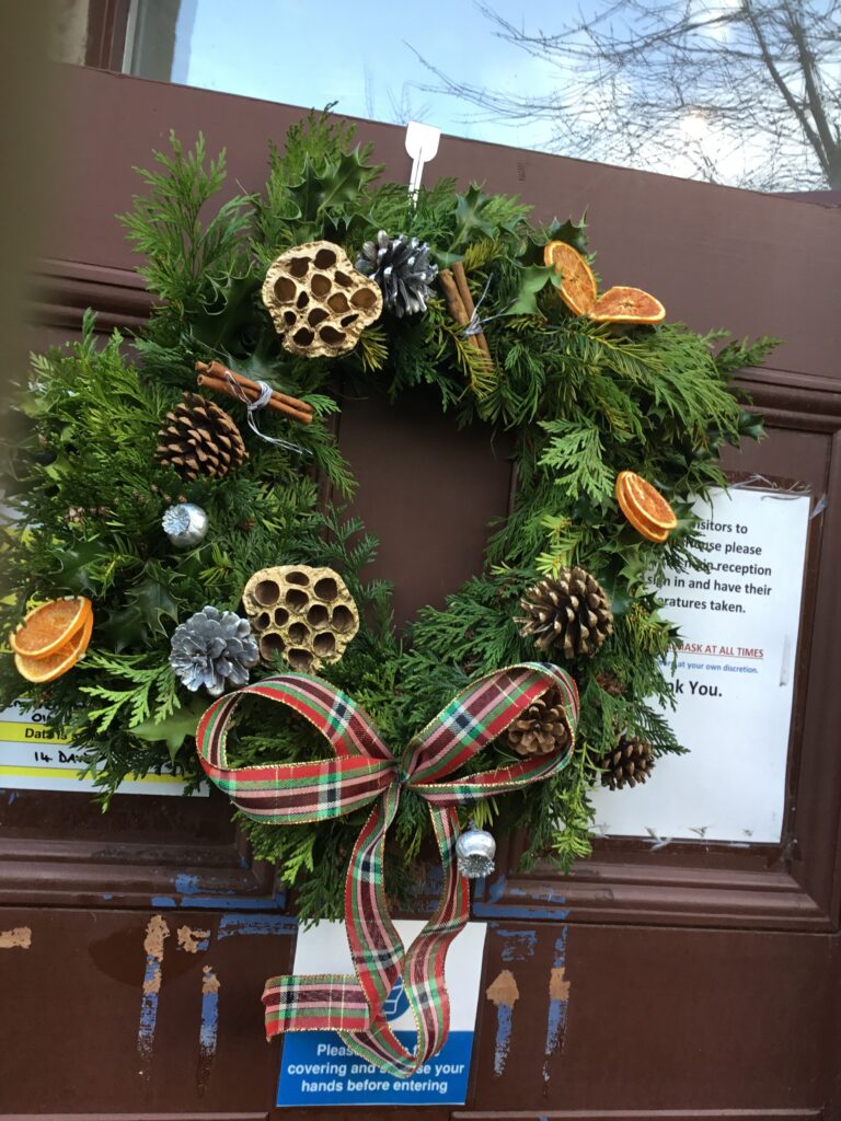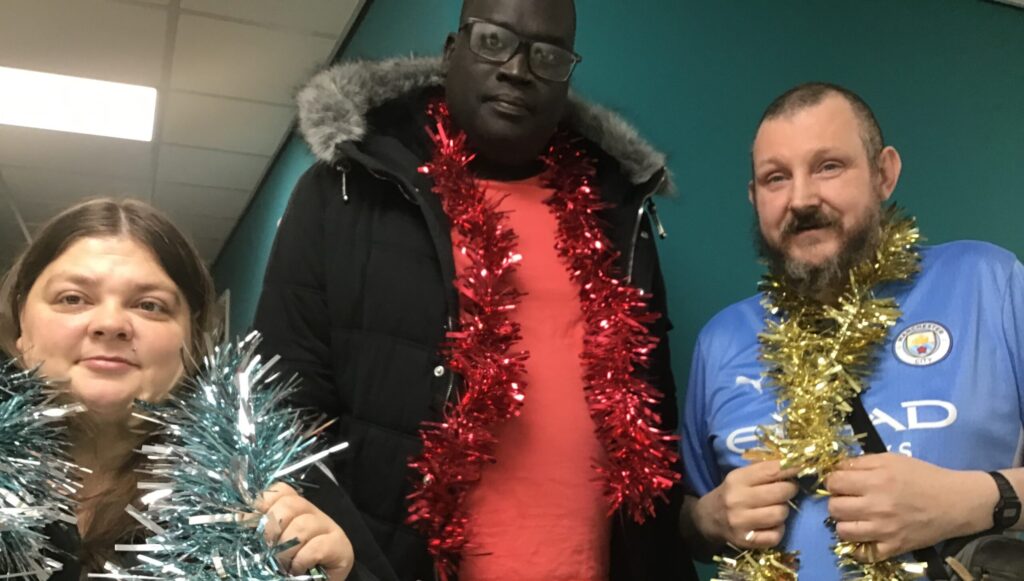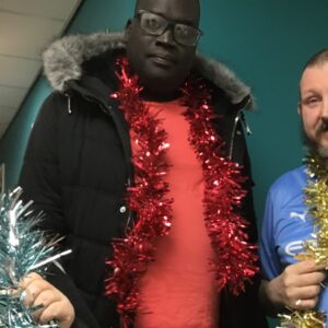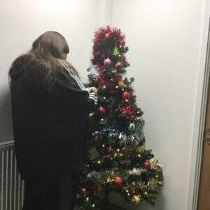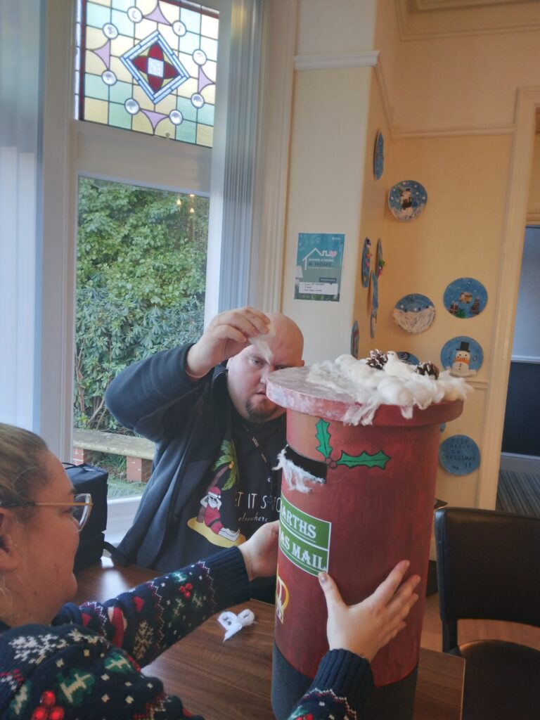 Trees were put up, bunting was hung, and lights were strung. Residents from some of our services also created some homemade ornaments and decorations – Radcliffe Lodge residents created some ornaments, Holland House residents created some brilliant baubles and snowmen decorations from pairs of white socks, and Merchants House residents decorated a beautiful Christmas wreath for the front door.