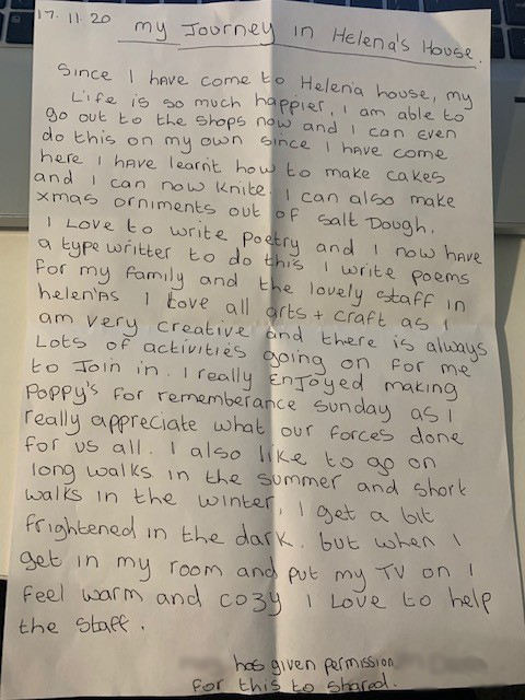 I love to write poetry and I now have a typewriter to do this. I write poems for my family and the lovely staff in Helena’s. I love all arts and crafts as I am very creative and there is always lots of activities going on for me to join in. I really enjoyed making poppies for Remembrance Sunday as I really appreciate what our forces (have) done for us all.