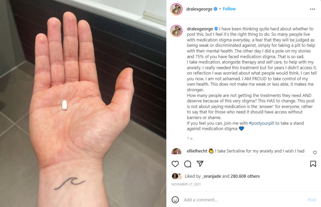 A recent example of a campaign aimed at breaking down the stigma surrounding medication and mental health is the #PostYourPill campaign. At the end of 2021, Dr Alex George, UK Youth Mental Health Ambassador, shared a post on his social media, revealing that he takes medication for anxiety. He encouraged others to share their mental health medications with the hashtag #PostYourPill.